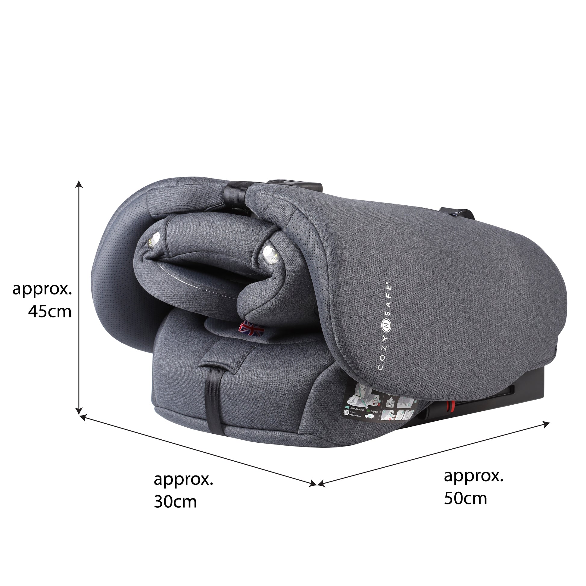 Practical details—like the space-saving foldable base for easy storage, and removable, machine-washable covers—make life a little simpler. From toddlerhood to pre-teen, the Cozy N Safe Cygnus is engineered for 12 years of secure, comfortable travel—without compromise.